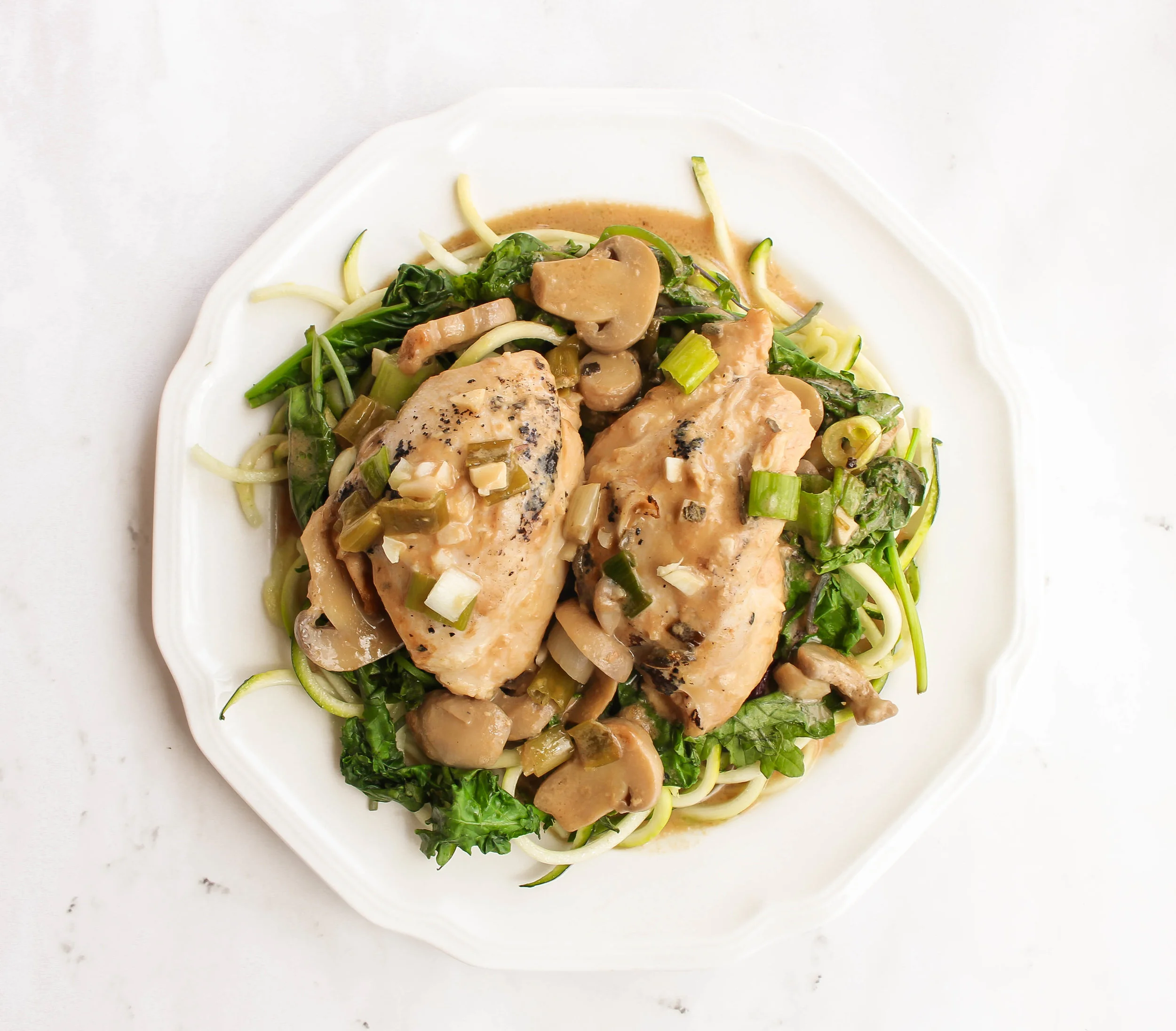 To assemble the plate, add ⅓ of the zucchini noodles to the plate, then layer with ⅓ of the wilted greens, and top with two chicken thighs. Pour ⅓ of the sauce over everything.