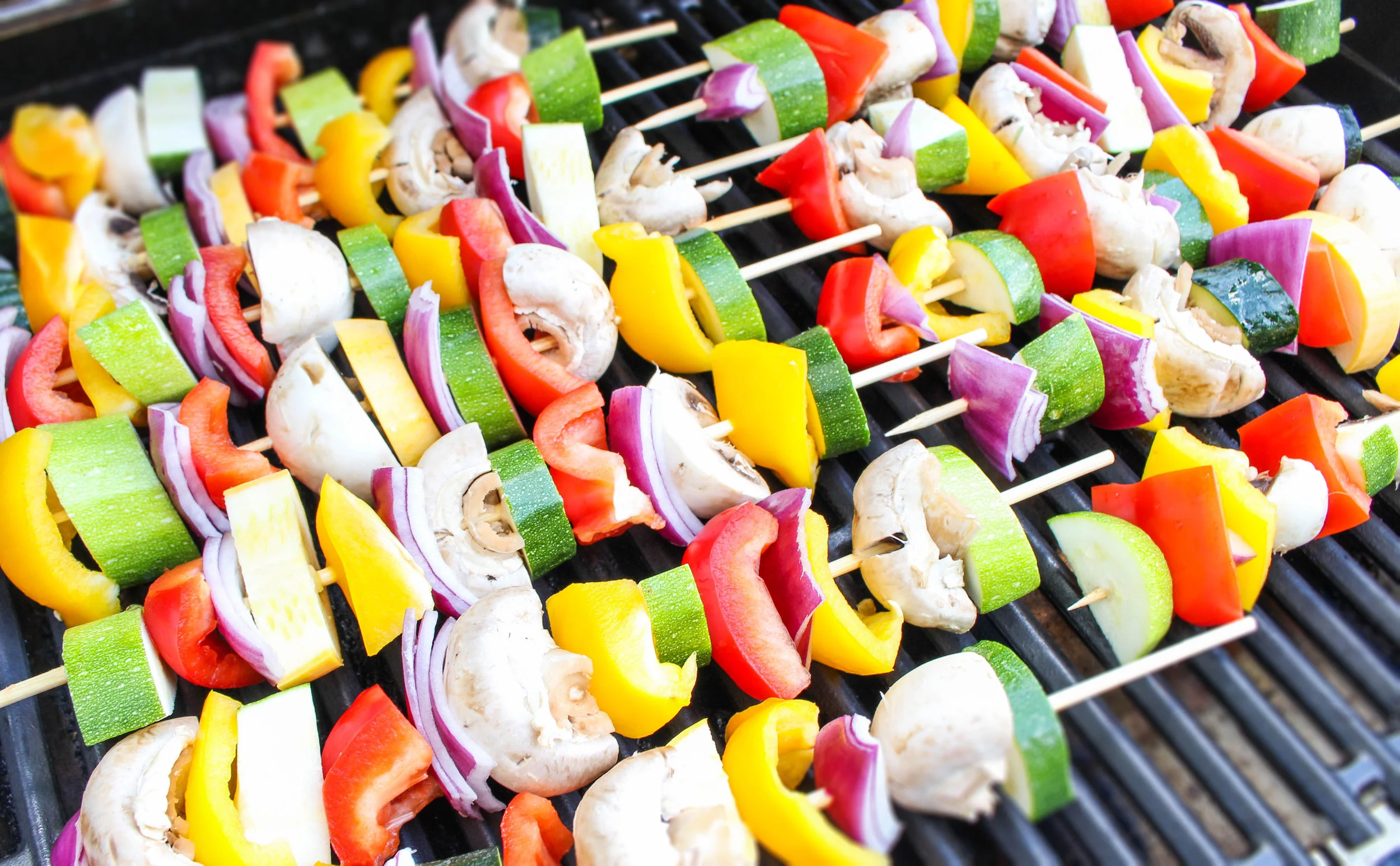 Grill the vegetable kabobs on the lowest grate, turning them every two minutes and moving them around the grill so they are equally heated. Grill until the vegetables are nicely browned, about 15 minutes. After 8 minutes add the meat skewers and grill for 5-8 minutes depending on how rare you like your steak. Rotate the meat skewers at least once.