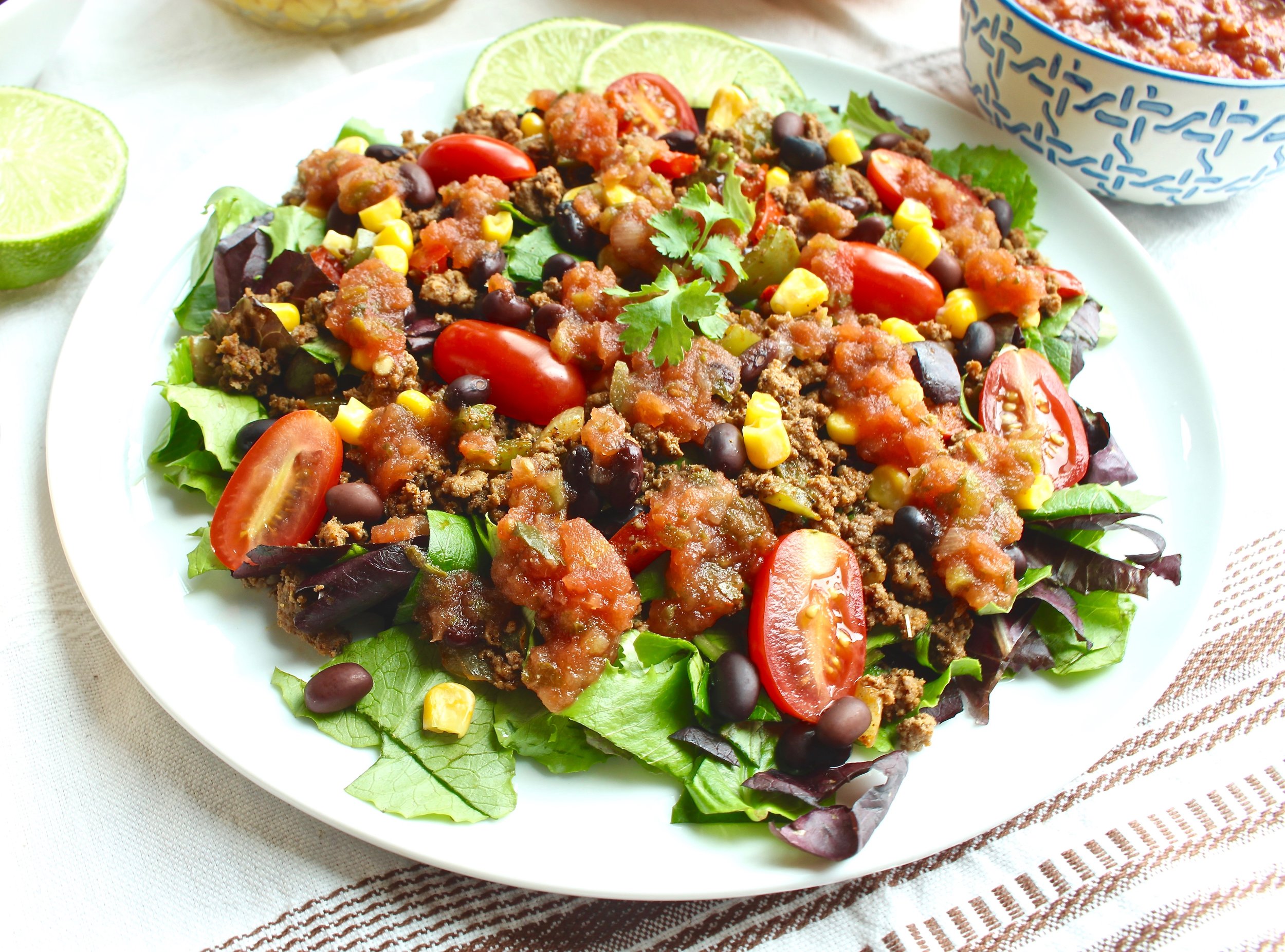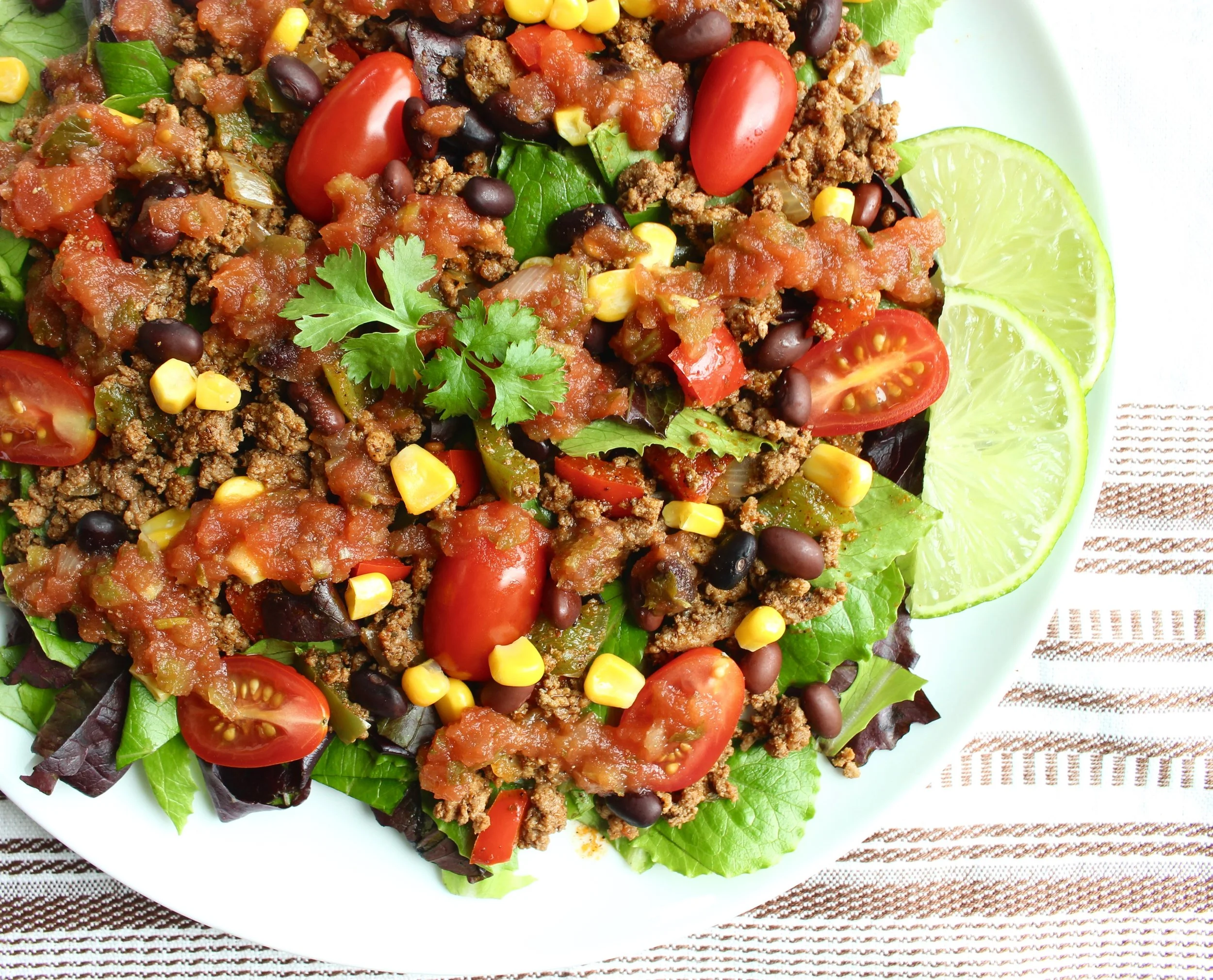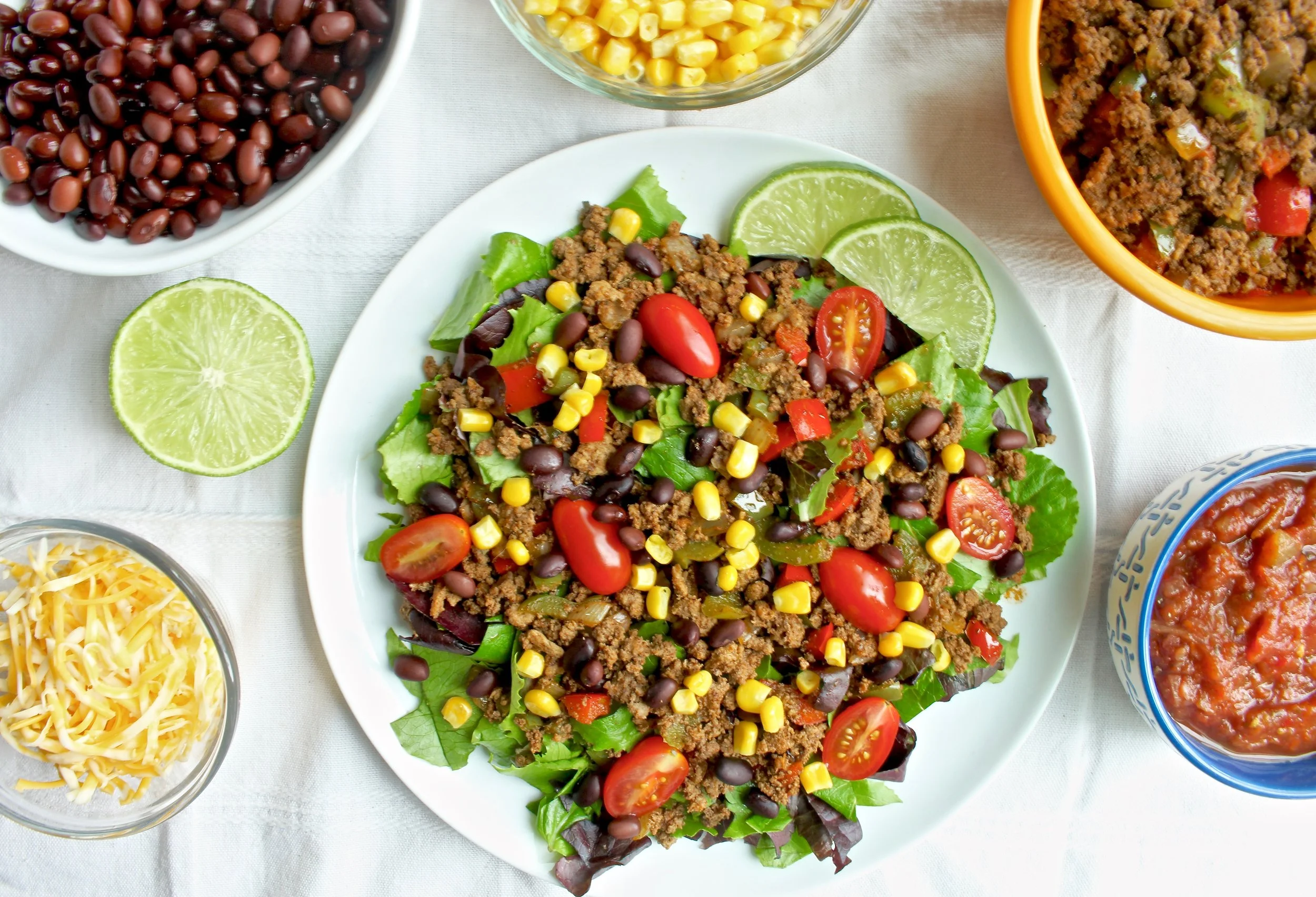 Heat a large skillet to medium heat, add a ½ TBSP olive oil to the pan and saute the ground turkey with the chopped peppers and onions. Cook for 6-8 minutes or until the turkey is no longer pink, vegetables are tender, and the meat is in small pieces. Add the taco seasoning, but do not add water unless the meat seems really dry. Divide the lettuce among 4 plates and top with the turkey, onion, and pepper mixture. Everyone can choose the remaining toppings (cherry tomatoes, black beans, corn, cheese, salsa, Greek yogurt, lime or cilantro). Enjoy!